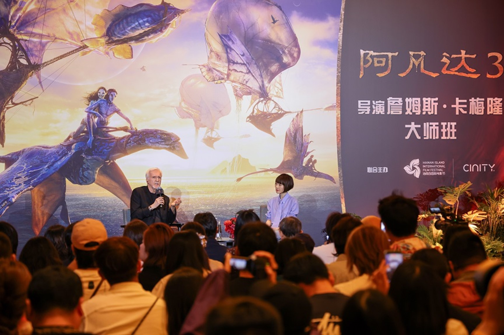 تحدث المخرج جيمس كاميرون في ورشة عمل خلال الدورة السابعة لمهرجان هاينان السينمائي الدولي في سانيا، مقاطعة هاينان، في 9 ديسمبر 2025. [صورة مقدمة من شركة والت ديزني]